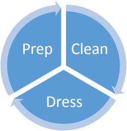 Prep: This includes patient preparation, collecting supplies, checking the order and identifying the patient as well as pain management and positioning. It ends with opening the supplies needed for cleaning the wound, placing the chux and removing the old dressing.