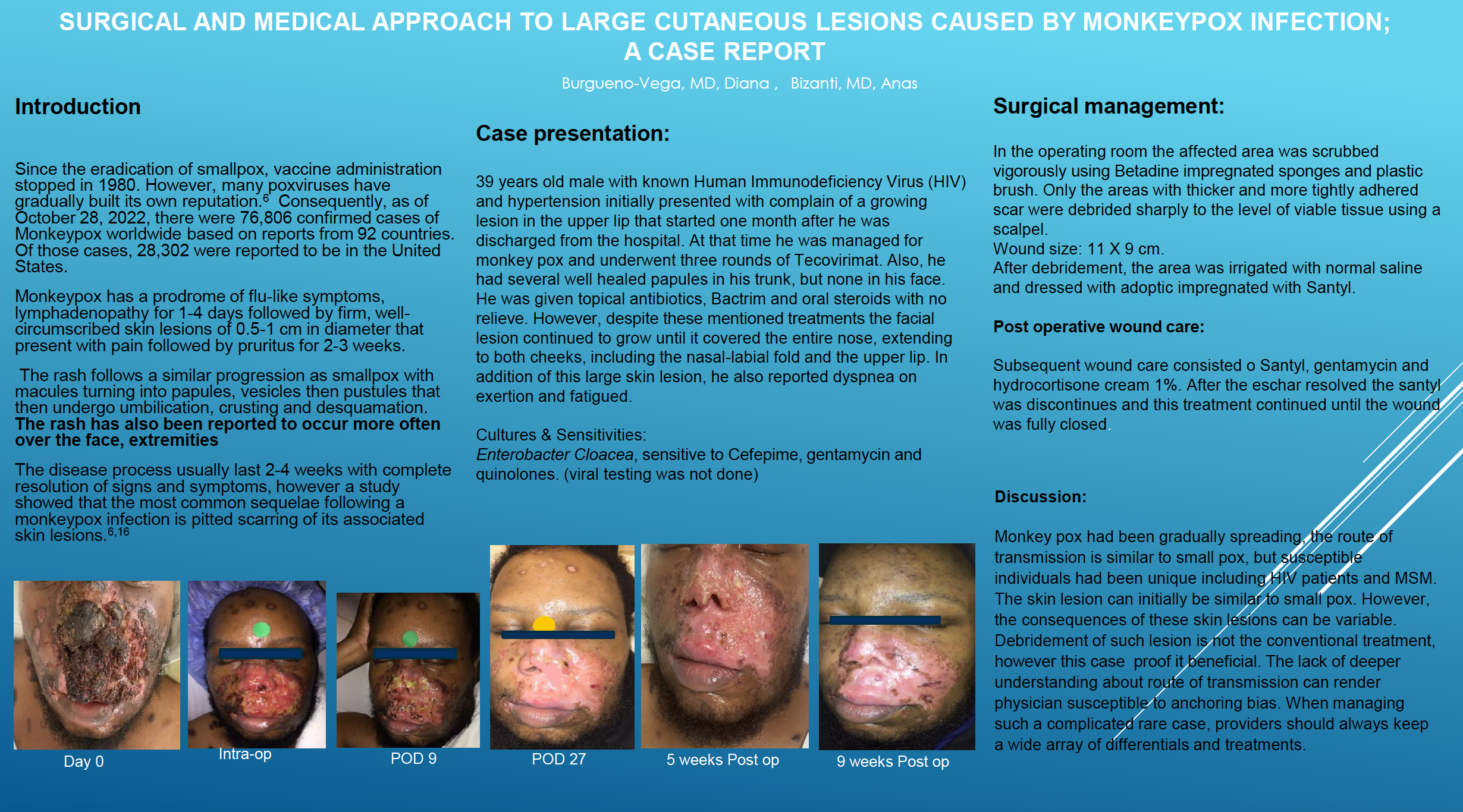 My name is Diana Burgueno-Vega, I'm a general surgery surgeon at Lakeland Regional. I've been practicing for 11 years at Lakeland. My main areas are general surgery and I do surgical wound care, which are mostly very difficult-to-treat and atypical wounds, such as the one that I'm presenting today is a gentleman who was infected with monkeypox, went through the acute phase, and developed multiple lesions, including some that were in his face.