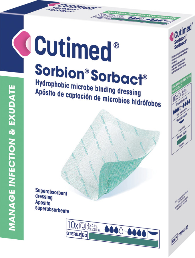 Cutimed® Sorbion® Border is a bordered, sterile, hydroactive, gel-forming, self-adhesive, superabsorbent wound dressing, offering atraumatic dressing changes. The dressing consists of a strong water-retaining superabsorbent core, a wound contact layer from a hypoallergenic polypropylene, a silicone adhesive border and a breathable, waterproof backing from polyurethane which allows the ability to shower.