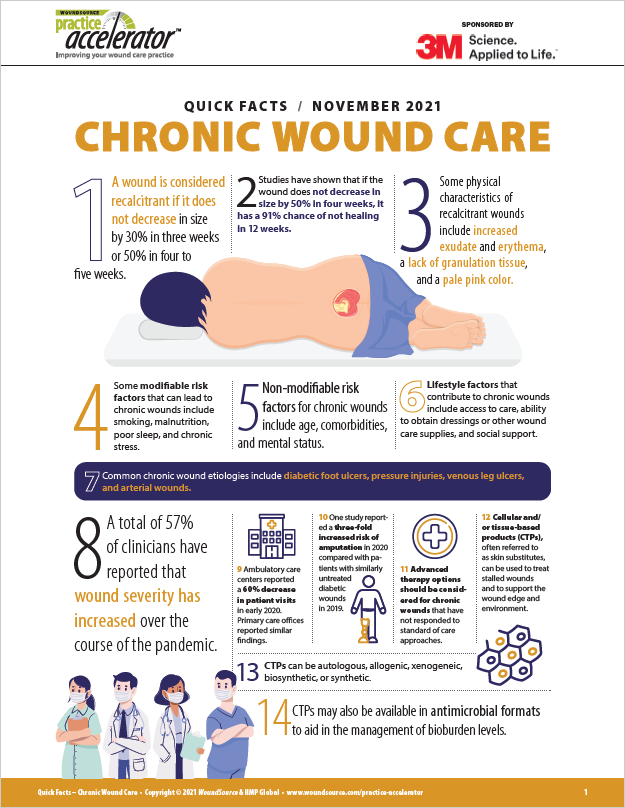 NOVEMBER IS CHRONIC WOUND CARE MONTH For this month's WoundSource Practice Accelerator series, we are providing education on a variety of topics related to the management of chronic wounds. Scroll below to read this month's white paper and articles, to print out our quick fact sheet, and to sign up for this month's webinar.