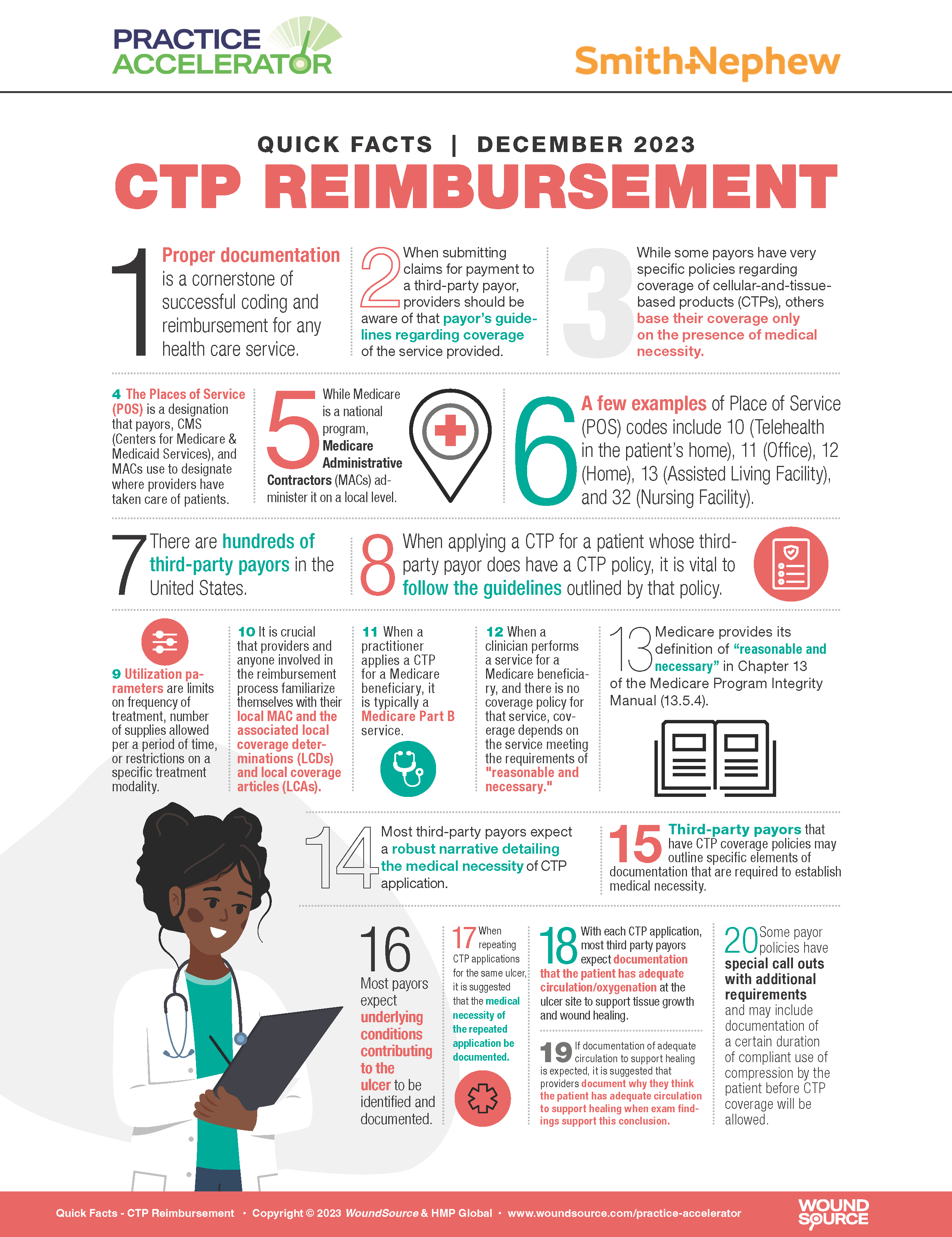 For this month's WoundSource Practice Accelerator series, we are providing education on a variety of topics related to reimbursement for cellular and/or tissue-based products (CTPs). Scroll below to read this month's white paper and articles, to print out our quick fact sheet, and to sign up for this month's webinar.