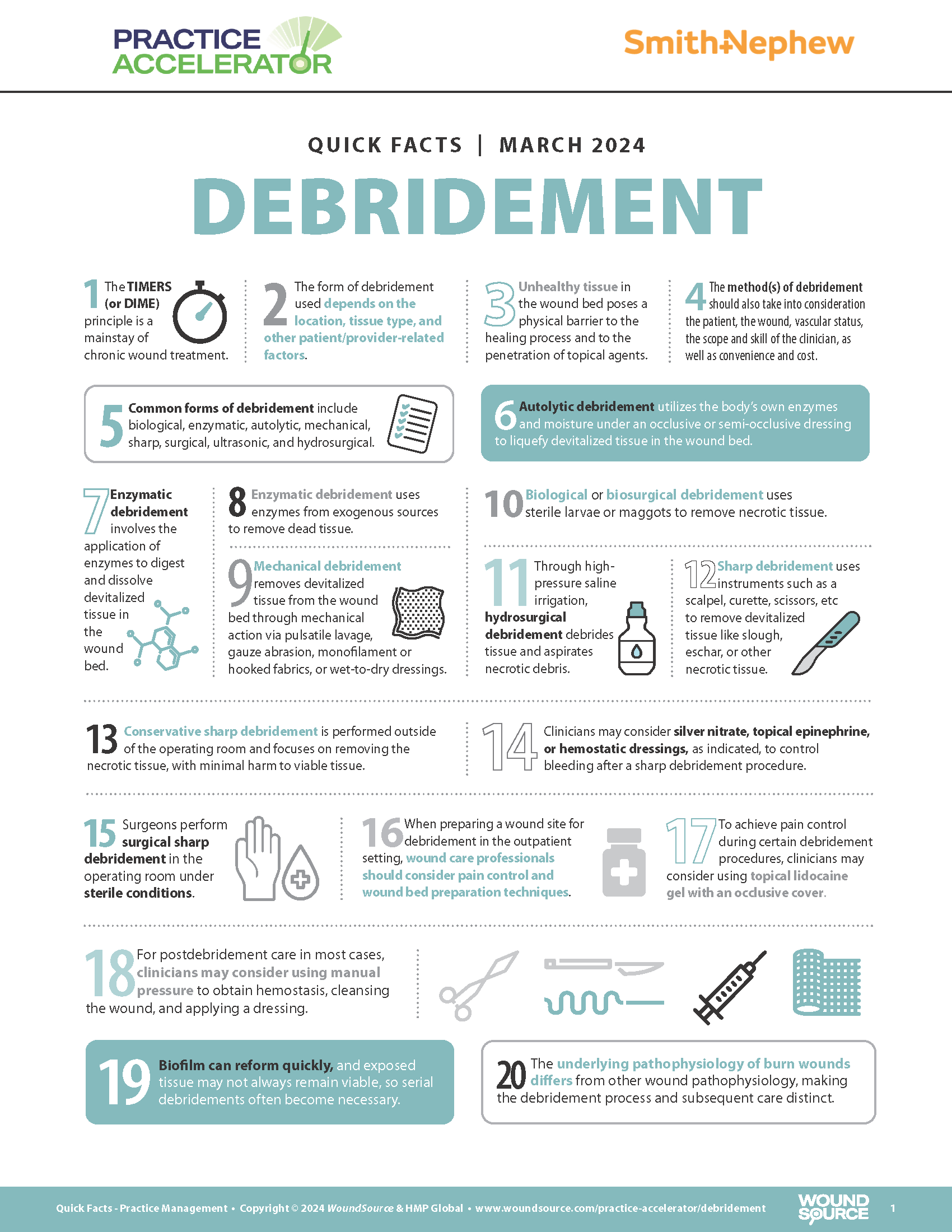 For this month's WoundSource Practice Accelerator series, we are providing education on a variety of topics related to debridement. Scroll below to read this month's white paper and articles, to print out our quick fact sheet, and to sign up for this month's webinar.