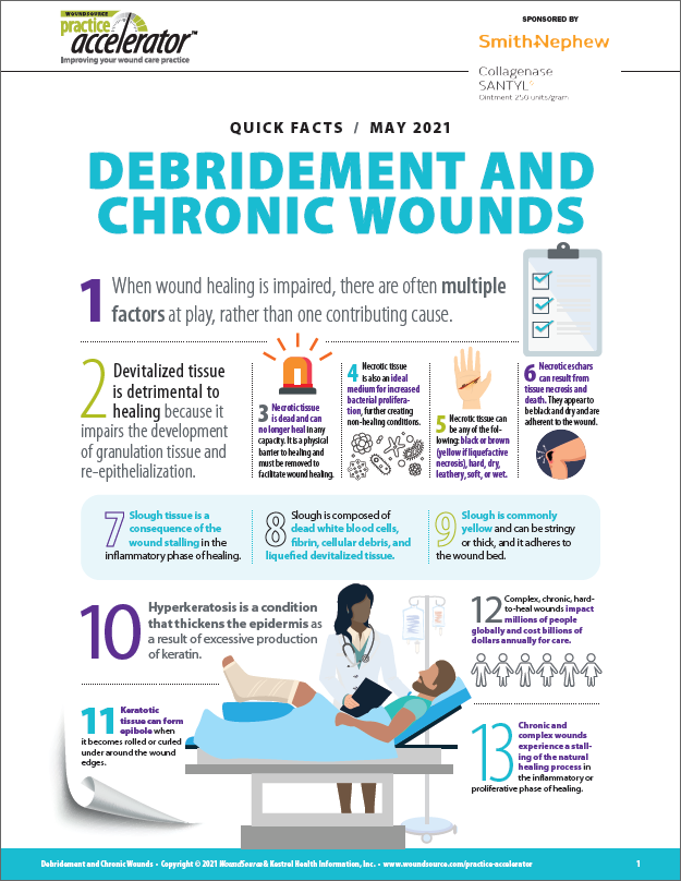 MAY IS DEBRIDEMENT AND CHRONIC WOUNDS MONTH For this month's WoundSource Practice Accelerator series, we are providing education on a variety of topics related to debridement methods and chronic wound management. Scroll below to read this month's white paper and articles, to print out our quick fact sheet, and to sign up for this month's webinar.
