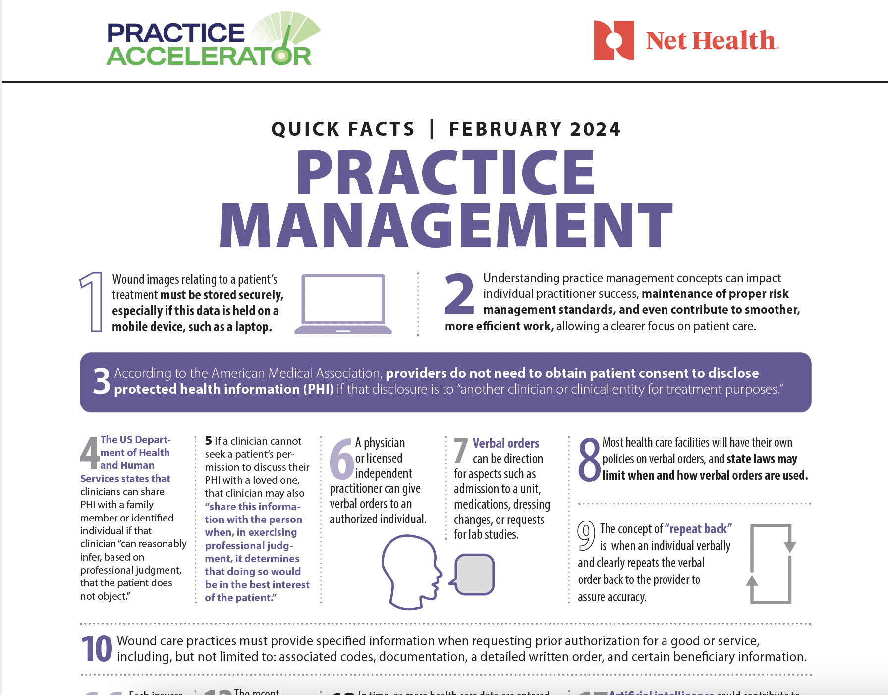 Wound care facilities need the involvement of the multidisciplinary team to ensure efficient practice management and resultant best outcomes for patients. As an umbrella term, practice management may have different meanings depending on an individual's role at a practice. It can involve documentation practices within an electronic health record (EHR), as well as financial, regulatory, and operational parameters. Several misunderstandings relating to HIPAA requirements and regulatory practice cir...Fact Sheet