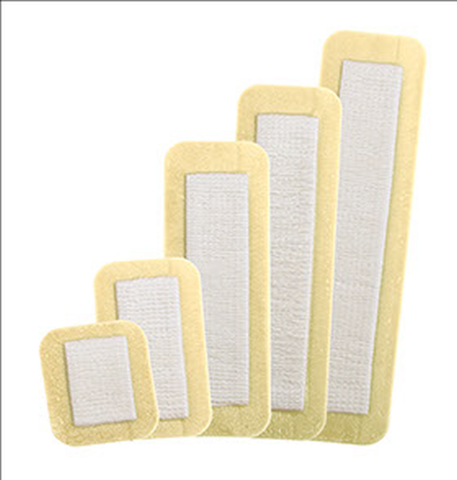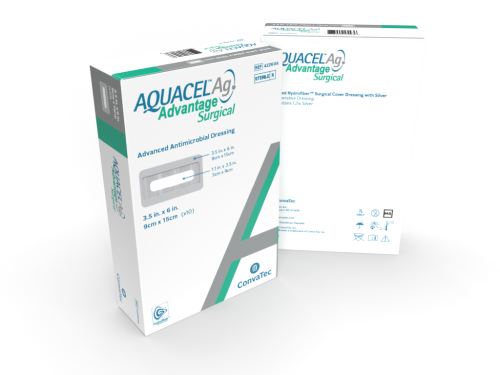 AQUACEL® Ag Advantage SURGICAL cover dressings are sterile, post-operative dressings comprising an inner (wound contact) non-woven pad composed of 1.2% ionic silver impregnated sodium arboxymethylcellulose fiber with added ethylene-diaminetetraacetic acid disodium salt (EDTA) and benzethonium chloride, stitched with nylon and elastane. Pad is held in place between a top layer of hydrocolloid bound to an outer polyurethane film and a windowed skin contact hydrocolloid layer.