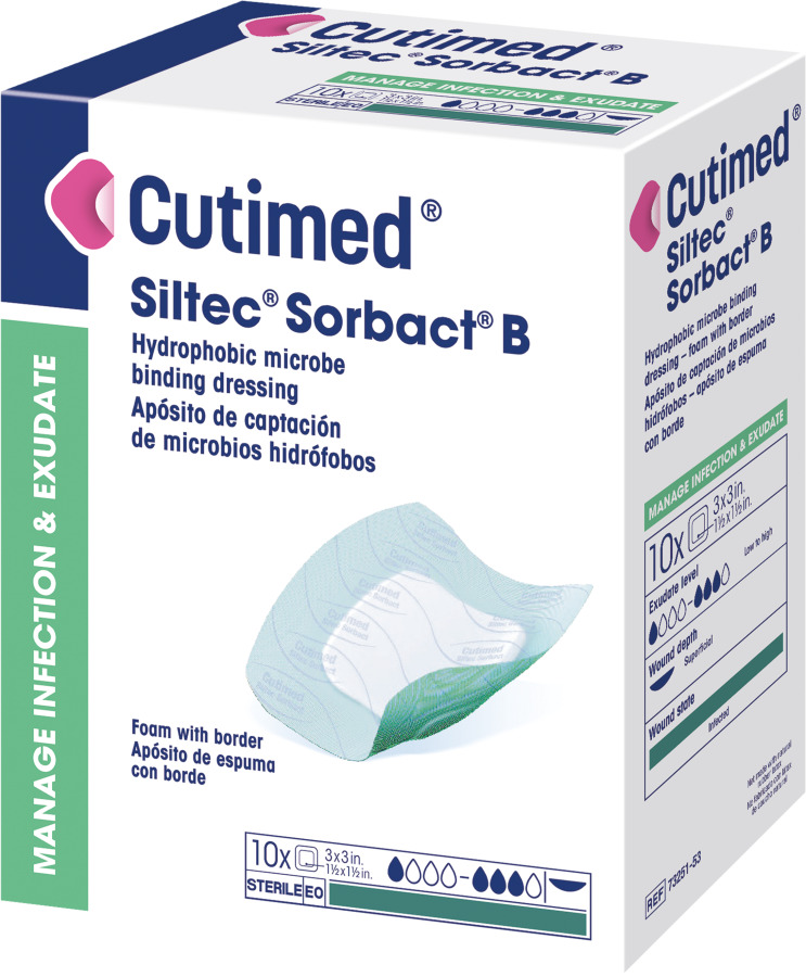 Cutimed® Siltec® Sorbact® B is a hydrophobic bacteria binding wound dressing, based on Sorbact® Technology. The green Sorbact® wound contact layer allows passage of wound exudate into the absorbent silicone-coated polyurethane foam dressing. Super-absorbent stripes are designed to lock away wound exudate within the dressing, minimizing the risk of potential skin macerations. Silicone adhesive border allows for atraumatic dressing removal.