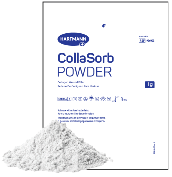 CollaSorb is made from 100% non-hydrolyzed type 1 bovine native collagen. It transforms into a soft gel when in contact with wound exudate.