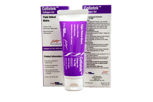 Collatek® Collagen Gel is 100% non-hydrolyzed type 1 bovine native collagen. Proprietary Kollagen™ technology process protects and retains significantly more native triple helical protein structure, thus allowing superior stability of the molecule and scaffolding through all four phases of wound healing.