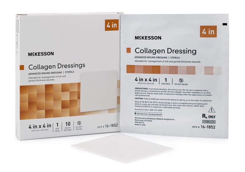 McKesson Collagen Dressings transform into soothing gel upon contact with exudate. Alginate and CMC absorb wound drainage while maintaining an optimal moisture balance to aid in the formation of granulation tissue and epithelialization.