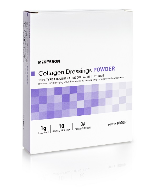 McKesson Collagen Dressing Powder is 100% bovine type I collagen that maintains a soft, moist wound environment in the presence of exudate. Convenient powder solution conforms easily to a wound without having to cut and size a sheet dressing.