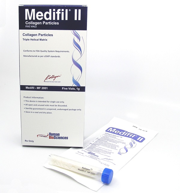 Medifill® II Collagen Particles are 100% non-hydrolyzed type 1 bovine native collagen. Proprietary Kollagen™ technology process protects and retains significantly more native triple helical protein structure, thus allowing superior stability of the molecule and scaffolding through all four phases of wound healing.
