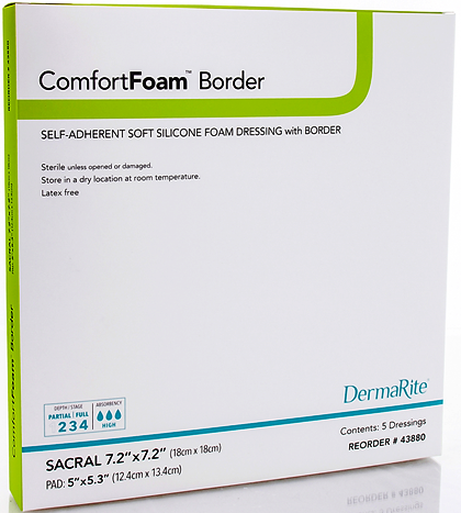 ComfortFoam™ Border is a five-layer self-adherent silicone foam island dressing that features a full silicone contact surface, fast absorbency foam, moisture-wicking and -locking fiber layers, and waterproof polyurethane film backing.