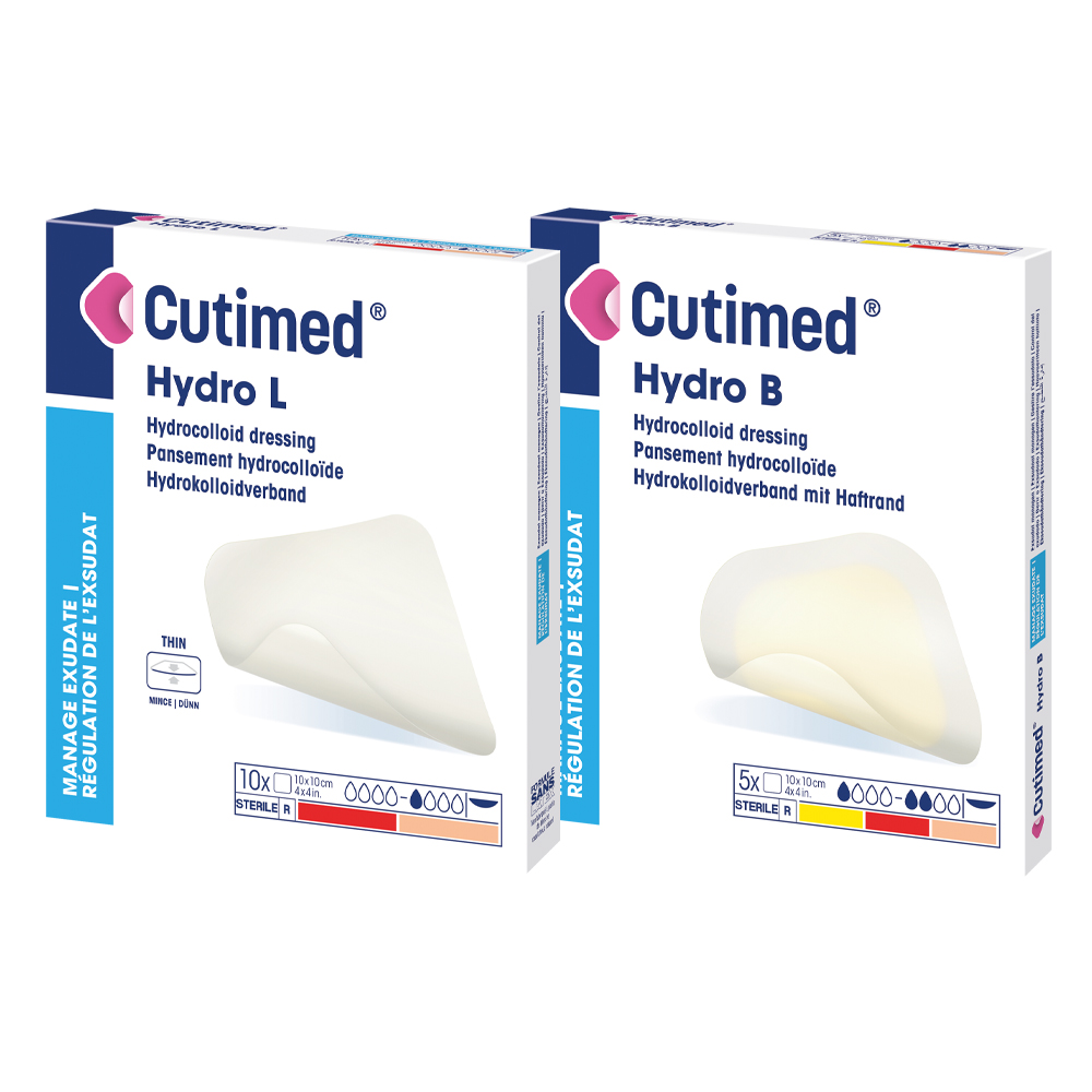 Cutimed® Hydro L and B are sterile, self-adherent, hydrocolloid dressings. Cutimed® Hydro L is for superficial dry to light exudating wounds. Cutimed® Hydro B has tapered edges, adhesive border, and a foam layer topped with a permeable film.