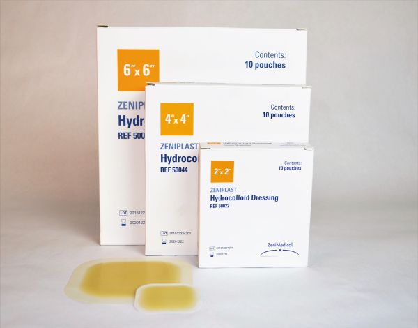 Hydrocolloid wound dressings are wafers, powders, or pastes composed of gelatin, pectin, or carboxymethylcellulose. Absorption capability depends on thickness and composition. Wafers are self-adhering and available with or without an adhesive border and in a wide variety of shapes and sizes. They are useful on areas that require contouring, such as the heels and sacrum. Powders and pastes require a secondary dressing. Indicated for partial- and full-thickness wounds with or without necrotic tissue.