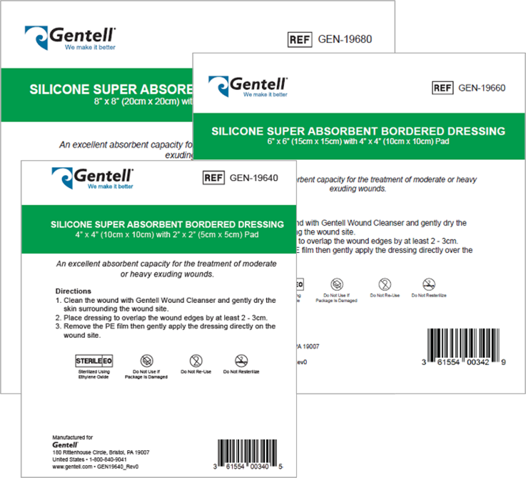 Gentell Silicone Super Absorbent Bordered Dressing's multi-layer construction has excellent absorbent capacity for treatment of moderate or heavy exuding wounds. Comfortable, breathable, and waterproof non-woven backing with silicone border provides gentle adherence for fragile skin.