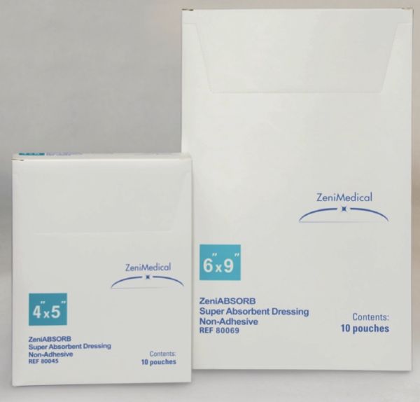 ZeniABSORB is a sterile, multilayered dressing used to absorb moderate to heavily drainage. Composed of water-resistant backing, superabsorbent core and hydro-penetrating layers to lock exudate in the dressing.