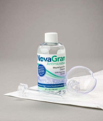 Wound cleansers are solutions used to remove contaminants, foreign debris, and exudate from the wound surface or to irrigate a deep cavity wound. Ingredients may include surfactants, wetting agents, moisturizers, and/or antimicrobials. They may be a rinse or no-rinse formula. Indicated for wound cleansing or irrigation at each dressing change using gauze or sponges or as a solution placed in a device that accomplishes irrigation and debridement.