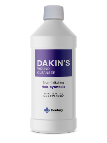 Dakin's Wound Cleanser is the same non-cytotoxic, low-foaming formulation as Di-Dak-Sol (Diluted Dakin's Solution). It mechanically cleanses acute and chronic wounds, stage 1-4 pressure injuries, diabetic foot ulcers, and burns.