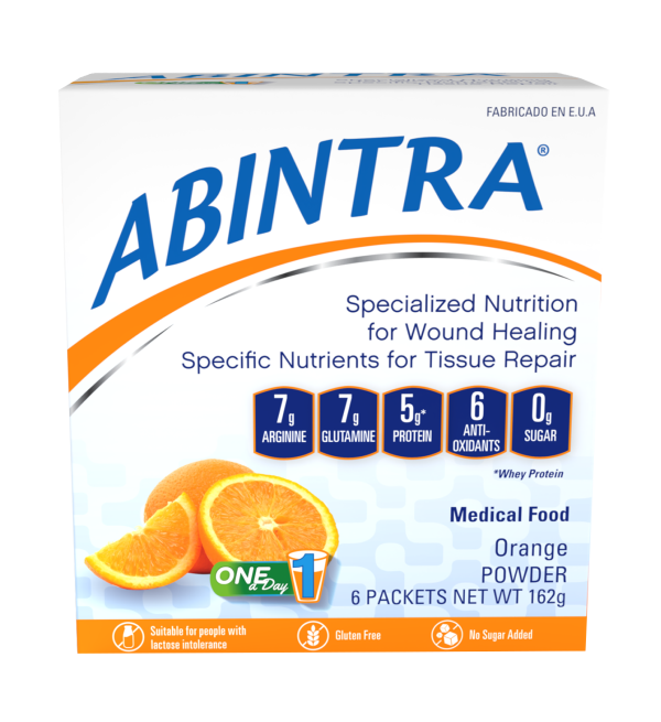 ABINTRA® is a specialized nutritional supplement specifically formulated to provide patients with nutrients that will promote wound healing. Contains a combination of arginine, glutamine, whey protein and antioxidant vitamins and minerals in therapeutic amounts to promote tissue synthesis and wound healing.