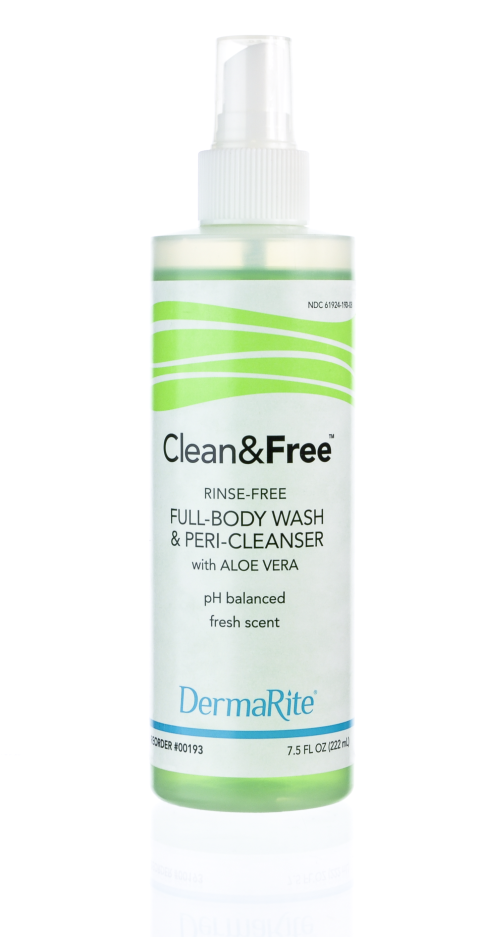 Clean & Free™ Rinse-Free Cleanser is a mild body wash, shampoo, and perineal cleanser that cleans and refreshes without water. pH-balanced. Contains aloe vera.