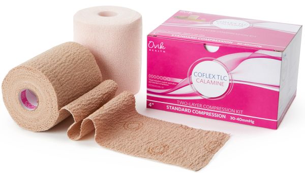 CoFlex TLC™ Calamine provides a two-step level of comfort and healing. Layer 1 is a soft foam roll impregnated with calamine that soothes and calms multiple skin conditions. Layer 2 is a short stretch compression bandage not made with natural rubber latex that sticks to itself, with visual indicators to aid in the application.