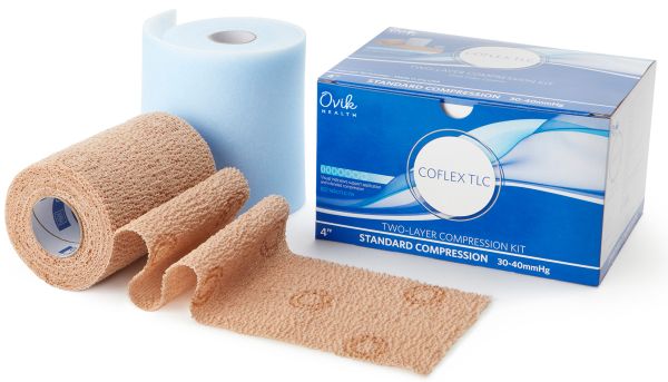 CoFlex® TLC, Two Layer Compression provides a two-step level of comfort and healing. Layer 1 is a soft foam roll with odor- and itch-control properties. Layer 2 is a short stretch compression bandage not made with natural rubber latex that sticks to itself, with visual indicators to aid in the application.