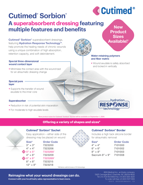 Cutimed® Sorbion® Sachet superabsorbent dressings demonstrate their effectiveness in the management of moderate to highly exudating wounds, utilizing Hydration Response Technology™ (HRT). The unique design concept of HRT combines numerous performance factors which aid in promoting ideal healing conditions.