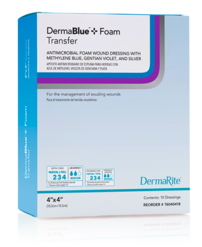 DermaBlue™+ Foam Transfer is indicated for moderately exuding, partial- to full-thickness wounds, including: pressure injuries, leg ulcers, diabetic foot ulcers, graft wounds and donor sites, skin tears, first- and second-degree burns, surgical wounds, lacerations and abrasions.