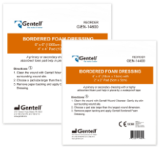 Irrigate the wound with Gentell Dermal Wound Cleanser and gently dry the skin surrounding the wound site. Select appropriate size Gentell Bordered Foam Dressing based on the dimensions of the wound. Remove paper backing from the dressing and apply directly over the surface of the wound. Repeat daily or as ordered by a physician.