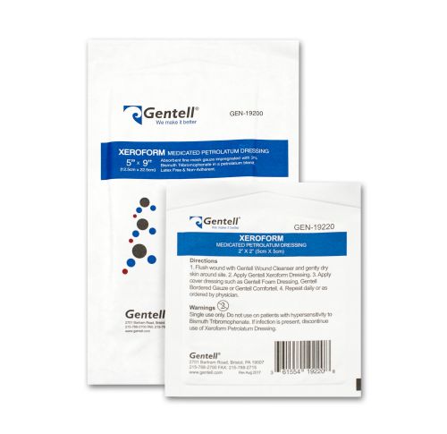 Gentell Xeroform Medicated Petrolatum Dressing is an absorbent fine mesh gauze impregnated with 3% bismuth tribromophenate in a petrolatum blend.