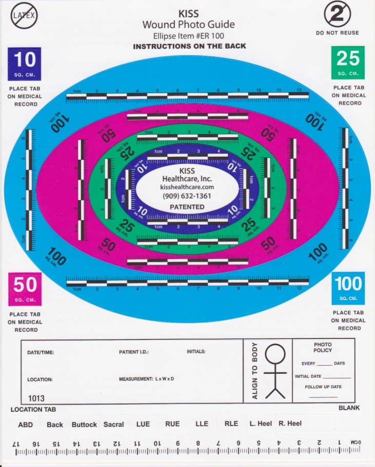 • Aids in photographic documentation of wounds through color-coded ellipses standardized to specific areas and lengths