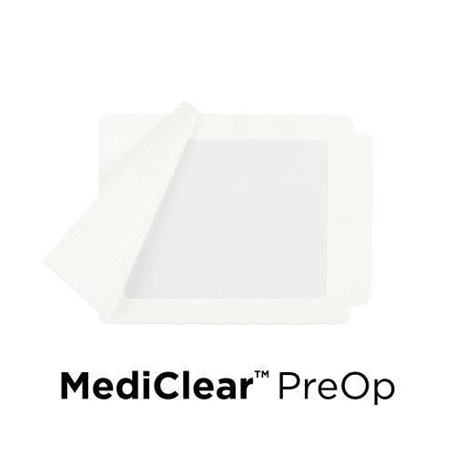 MediClear™ PreOp should be removed immediately prior to surgery by a clinician in the operating room under sterile conditions as part of preparing the patient for the procedure. Remove MediClear™ PreOp by gently lifting one edge and slowly peeling away. Prepare the surgical site as per facility protocol.