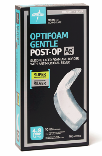 Optifoam® Gentle Ag+ Superabsorbent Post-Op is an antimicrobial silicone bordered and faced post-operative foam dressing with superabsorbent core and flexible design.