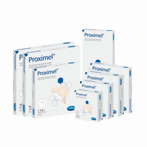 Proximel® Border is indicated for pressure injuries, leg and foot ulcers, traumatic wounds, surgical wounds, donor sites, skin tears, first- and second-degree burns, and dry or necrotic wounds in combination with gels.