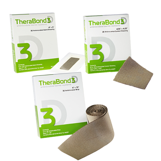 Therabond® 3D Antimicrobial Systems are absorbent, post-operative dressings consisting of silver-plated nylon three-dimensional fabric. Provides an effective barrier to bacterial penetration for up to 14 days. In the presence of exudate, the dressing will help maintain a moist wound environment.