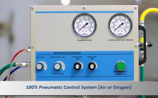 VersalVent Model V1 is a pneumatically powered, time-cycled, volume-constant, inspiratory-flow-adjustable, single-circuit hyberbaric chamber ventilator that produces a square wave flow pattern and is compatible with either monoplace or multiplace hyperbaric systems.